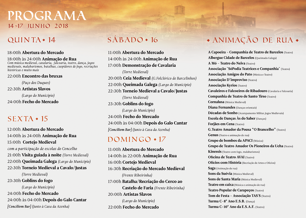 "Barcelos Cidade Medieval" is an organization of the "Associação Burgo Divertido" with the support of the Municipality of Barcelos. The full program of the event is available here: