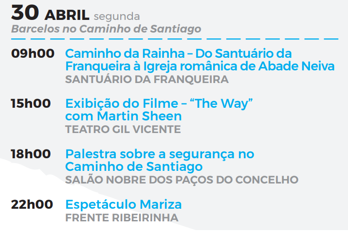 O dia 30 de abril iniciará com uma Caminhada entre o Santuário da Franqueira e a Igreja Românica de Abade de Neiva. A tarde do dia 30 de abril inclui a projeção do filme "The Way" no Teatro Gil Vicente e uma Palestra relativa ao Caminho Português de Santiago no Salão Nobre dos Paços do Concelho. O dia de "Barcelos no Caminho de Santiago" terminará com a atuação de Mariza.