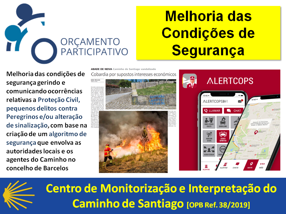 - melhoria das condições de segurança ao longo do percurso no concelho de Barcelos, nomeadamente na redução da probabilidade da ocorrência de pequenos delitos (assaltos, exibicionismo, etc.) contra Peregrinos, com base na criação de um algoritmo de segurança que envolva as autoridades locais e os agentes do Caminho no concelho de Barcelos;