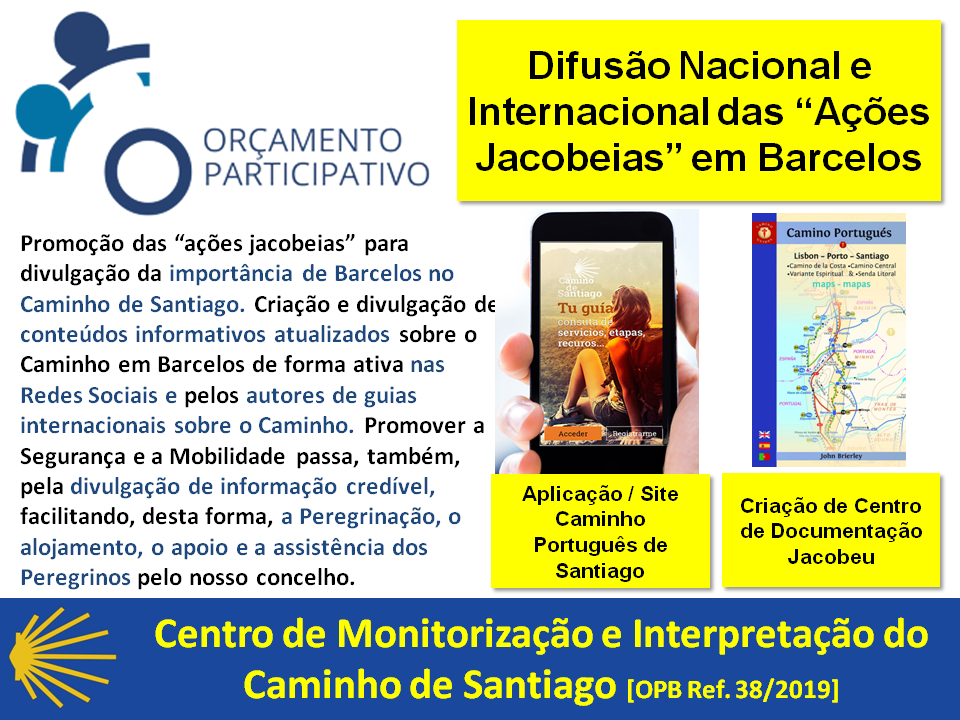 - difusão local, nacional e internacional de ações/atividades (incluídas numa programação anual de atividades jacobeias para peregrinos e/ou para barcelenses) associadas ao Caminho de Santiago e na atualização de informação sobre os itinerários e pontos de apoio aos autores dos guias internacionais de referência do Caminho Português de Santiago.