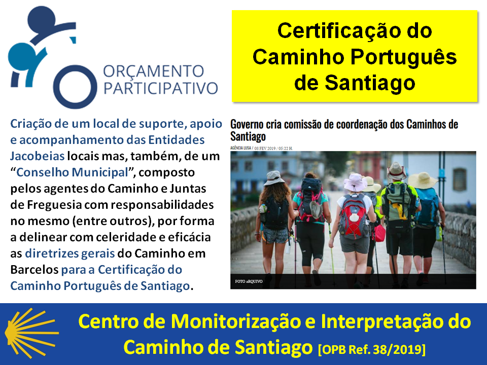 O Caminho ("Central") Português de Santiago, sendo a via estruturante e principal do Caminho Português de Santiago (com passagem por Barcelos), percorrida pelo maior número de Peregrinos em direção a Santiago de Compostela (em território nacional), apoiada por várias estruturas e/ou entidades, nomeadamente Albergues, Associações e Help Points, não pode perder a sua importância e preponderância relativamente às várias variantes que têm vindo a ser impulsionadas principalmente por investimento público “extraordinário”. As dezenas de Peregrinos (centenas, entre abril e outubro) que percorrem diariamente este itinerário são, acima de tudo, um Património Imaterial promotor da Espiritualidade, da Universalidade e da Paz entre os povos mas, também, são potenciadores do desenvolvimento das áreas rurais e de baixa densidade, dinamizando a sua economia (em alguns casos, são a principal fonte de receita). “Diz-se” que um Peregrino gasta, pelo menos, 1.00 € por km percorrido. Se Barcelos possui (aproximadamente) 30 km de itinerário percorrido por 50.000 Peregrinos por ano, estamos perante a distribuição de, pelo menos, um milhão e quinhentos mil euros pelo concelho de Barcelos por ano. Desta forma, proteger e realizar ações de valorização de Barcelos no Caminho Português de Santiago é, também, potenciar a microeconomia e sustentar indiretamente postos de trabalho do concelho de Barcelos pelo fenómeno da Peregrinação. Em síntese, em face do exposto, mas também pela recente publicação do Decreto-Lei n.º 51/2019, de 17 de abril, é de especial interesse público promover a criação de um CENTRO DE MONITORIZAÇÃO E INTERPRETAÇÃO DO CAMINHO DE SANTIAGO na cidade de Barcelos como base e ferramenta aglutinadora, promotora e demonstradora do Património e Espírito Jacobeu barcelense.