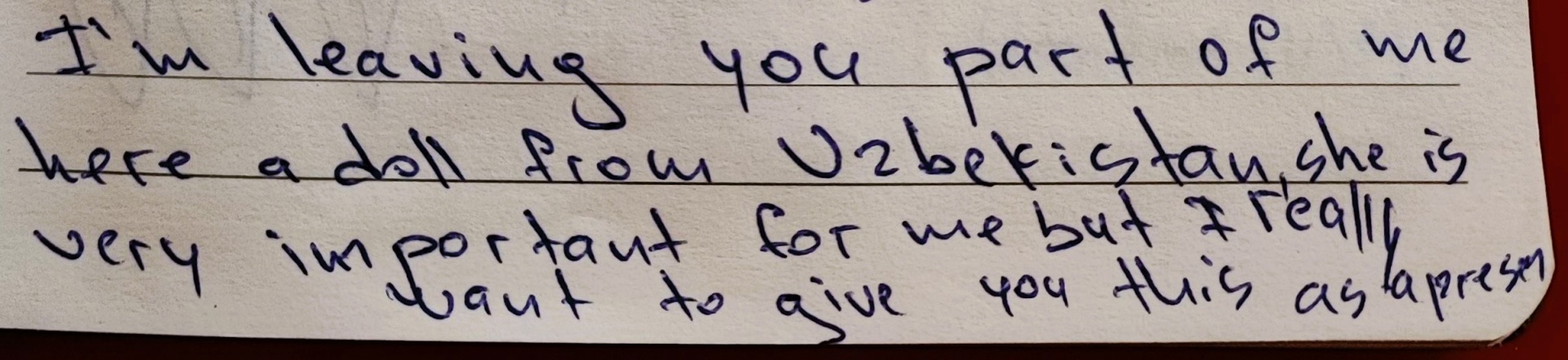 Dos milhares de Peregrinos já acolhidos no Albergue Cidade de Barcelos, ficam, por vezes, experiências e partilhas entre Peregrinos e Hospitaleiros Voluntários que são muito gratificantes. Ser possível "Fazer a diferença" é uma das razões para continuarmos a tornar possível este projeto de Hospitalidade e Doação que é o Albergue Cidade de Barcelos. Um dos exemplos desta partilha intensa entre Peregrinos e Hospitaleiros está representada nesta "boneca do Uzbequistão": uma Peregrina que acolhemos, proveniente dessa país, decidiu deixar-nos a sua "boneca" com a mensagem: "I'm leaving you a part of me...".