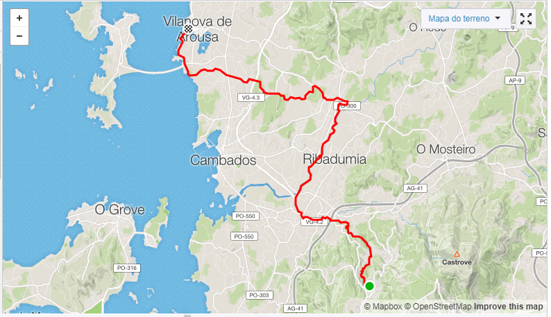 The Ruta do Rio Umia ends with the climb of one bridge to the center of the village. There, the Umia River is crossed again walking by the PO300. A less interesting part of the stage which allows, however, to find sidewalk cafes / restaurants.